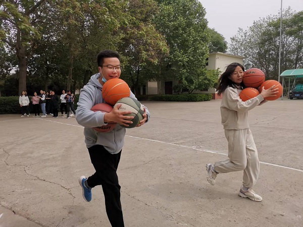 “誰(shuí)先來(lái)?抱球游戲升級(jí)——1人抱4個(gè)籃球向前奔跑,過(guò)程中一個(gè)球也不得落地,否則成績(jī)無(wú)效?!辈门兄坏膶徲?jì)科長(zhǎng)談增迫不及待地宣布?!皞€(gè)子高的胳膊、腿長(zhǎng),有優(yōu)勢(shì),先上?!比巳豪镉腥颂嶙h,工程科身高一米八的帥小伙劉文浩和綜合辦高個(gè)子王春影舉手示意,跑道上呈現(xiàn)二人灑脫、漂亮的抱球姿勢(shì)。