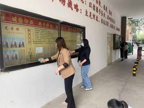院內整理清掃完畢后,大家又轉移陣地到辦公樓內,對辦公室、廁所、樓道等區(qū)域進行了打掃。黨員們充分發(fā)揚“甩開膀子、挑起擔子”的精神,擦拭玻璃、打掃地面、清理垃圾,全方位消毒噴殺,每一步都認真到位,不留死角。經(jīng)過近三個小時的辛勤勞動,院里綠化帶的枯枝、雜草得到了整治,機關大院內更加整潔美觀,環(huán)境煥然一新。機關辦公室窗明幾凈、一塵不染,所有衛(wèi)生死角被徹底清理。大家擦擦汗水,露出會心的微笑。