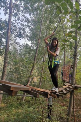 “叢林穿越”項目最受大家歡迎,有空中秋千、索道、走鋼絲、獨(dú)木橋、空中云梯、吊橋等一系列的拓展環(huán)節(jié)。叢林穿越過程中,劉暢作為今年新入職的職工,第一個走上了獨(dú)木橋的平臺上,只見她的雙手緊緊地抓住兩邊的繩子,目光堅定,腳步穩(wěn)健,順利完成了第一個挑戰(zhàn)項目——獨(dú)木橋。隨后,來到走鋼絲的環(huán)節(jié),只見她小心翼翼試了試腳感,感覺比較安全,然后小碎步開始向前走。突然,鋼絲像秋千似的蕩起來,于是她就改變了策略,邁開大步向前走,本來晃動挺厲害的鋼絲慢慢靜止下來,找到了最佳的方法后,還不忘向后面的同事傳授闖關(guān)秘籍,最后在她不懈的努力下闖關(guān)成功。就在大家紛紛踴躍嘗試拓展項目的過程中,發(fā)生了一個令人感動的小插曲。機(jī)關(guān)后勤人員桂淑霞在闖空中云梯環(huán)節(jié)中,由于體力不支,突然她的雙腿從梯子的空隙中跌落下去,卡在梯子中,動彈不得。正在后面闖關(guān)的財務(wù)科科長宋敬凱看到了這一幕,他不顧自己的安危,飛快跑過去,幫桂淑霞把雙腿從空隙中“拔”了出來,使她脫離險境。