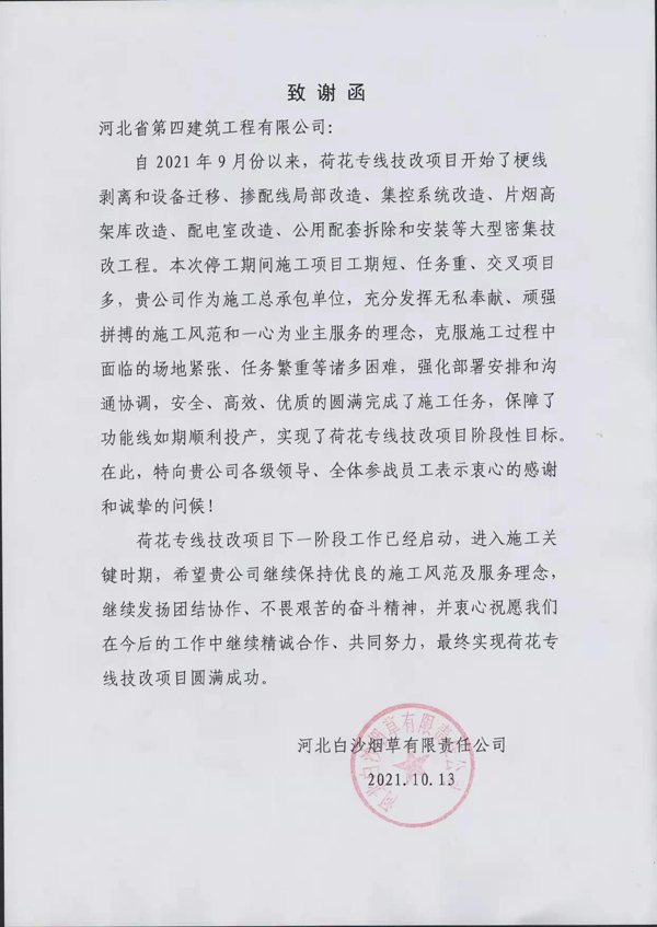 一紙致謝函,字字鼓人心!10月13日,三分公司中煙項(xiàng)目部收到業(yè)主河北白沙煙草有限責(zé)任公司發(fā)來(lái)的致謝函,感謝項(xiàng)目部克服場(chǎng)地緊張、任務(wù)重等諸多困難,圓滿完成施工任務(wù),實(shí)現(xiàn)了荷花專線技改項(xiàng)目階段性目標(biāo)。