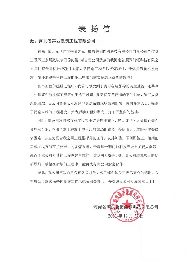 2022年元旦前夕,一封表揚(yáng)信的到來讓十分公司的節(jié)日氛圍更添喜悅。2021年12月27日,十分公司河南順聚焦化項(xiàng)目收到來自業(yè)主方致公司的表揚(yáng)信,對項(xiàng)目部攻堅(jiān)克難爭當(dāng)先鋒、誠信履約做出表率提出表揚(yáng),同時(shí)對項(xiàng)目管理團(tuán)隊(duì)在備煤系統(tǒng)筒倉工程及后續(xù)工程施工中做出的貢獻(xiàn)表示誠摯的感謝。