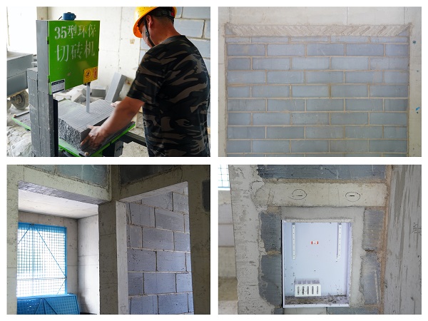 在材料利用與成本控制方面,項目團隊探索出了“更優(yōu)解”。針對頂部斜砌施工,項目部原計劃采購混凝土預制塊進行砌筑,但在論證中發(fā)現(xiàn)采購的預制塊存在成本高、運輸損耗大、工序銜接慢等弊端。經(jīng)過反復研討,項目團隊決定就地取材,利用現(xiàn)場加氣混凝土砌塊施工剩余的裁切廢料,通過定型化切割模具進行精準切割,替代外購預制塊。為保障方案順利實施,項目部提前抽調(diào)技術嫻熟的切割工,組織加氣塊切割專項培訓,同時提前安裝調(diào)試好40余臺高精度切割設備,現(xiàn)場切割作業(yè)得以高效展開。這一創(chuàng)新方法的運用,將加氣塊材料的現(xiàn)場利用率提高到90%以上,其切割面更加平整,有效保障了斜砌質(zhì)量和結構整體性,提升了觀感效果。