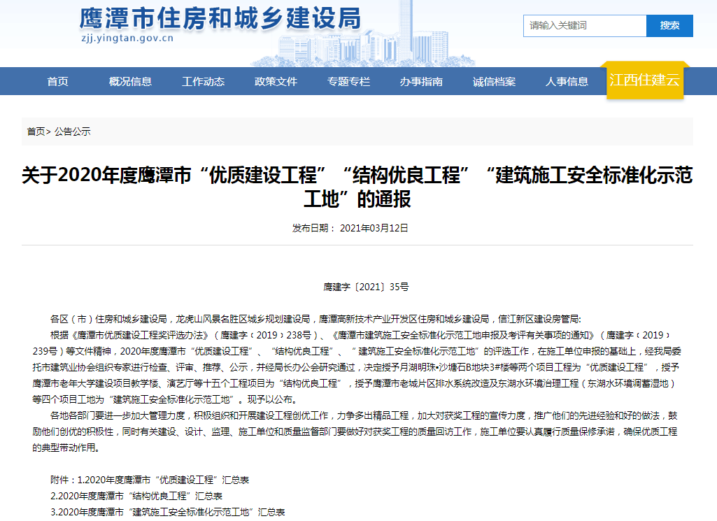 4月12日,從江西省鷹潭市住房和城鄉(xiāng)建設局網(wǎng)站獲悉,四分公司承建的鷹潭市檔案中心項目喜獲2020年度鷹潭市結(jié)構優(yōu)良工程和建筑施工安全標準化示范工地兩項榮譽。