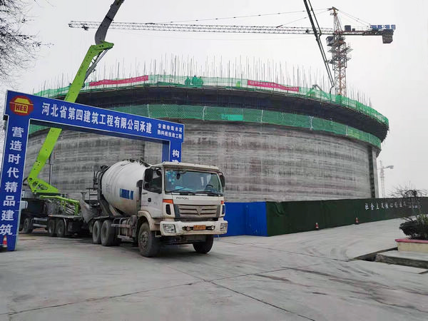熟料儲存及輸送筒倉直徑60米,高20.5米。1月11日,業(yè)主項目負(fù)責(zé)人王利杰組織召開專題會議,鄭重要求1月20日前滑模施工必須完成。面對業(yè)主早日投產(chǎn)的殷切期盼,項目部緊急組織施工策劃,明確搶進(jìn)度措施辦法,全體動員,多點(diǎn)發(fā)力,全力以赴?;J┕?。在動員會上,成立了以項目經(jīng)理為組長的滑模領(lǐng)導(dǎo)小組,班子帶班,明確責(zé)任目標(biāo);與作業(yè)班組簽訂安全、質(zhì)量承諾書,增強(qiáng)其責(zé)任意識;購置鋼筋間距測量設(shè)備,節(jié)省驗(yàn)收鋼筋工程時間和人力。由于疫情原因,現(xiàn)場勞力不能迅速到位,項目部提前組織管理人員晚上加班吊運(yùn)鋼筋、水泥、腳手板等材料,大家高漲的干勁兒在滑?,F(xiàn)場起到了積極的帶動作用。庫壁預(yù)應(yīng)力鋼絞線設(shè)置較為密集,每間隔26厘米一道,而且?guī)в腥嵝?,往庫壁鋼筋?nèi)穿設(shè)時容易跑偏,工作效率低。為加快施工,技術(shù)人員巧妙地在庫壁鋼筋上加設(shè)了U型鋼筋固定鋼絞線穿行位置,然后大家一字排開,“一二、一二……”齊聲喊著口號,有節(jié)奏地用力將鋼絞線在庫壁鋼筋里穿行直到扶壁柱。數(shù)九隆冬的夜間滑模平臺上氣溫很低,但是大家的工作熱情不減,干勁不退,抬鋼筋、綁鋼筋、穿鋼絞線……,干得熱火朝天,沒有人叫苦喊累,在大家的共同努力下,滑模以每天2.7米的速度快速推進(jìn)。