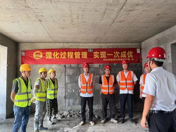 “為了強化全員質(zhì)量意識,弘揚工匠精神,促進操作技能、管理技能提升,現(xiàn)開展質(zhì)量月技能競賽……”項目主管師蔡昭作為總裁判作了賽前動員,宣布了比賽內(nèi)容、規(guī)則、程序、評分標準等,今年新入職職工、部分作業(yè)工人及工長觀賽。